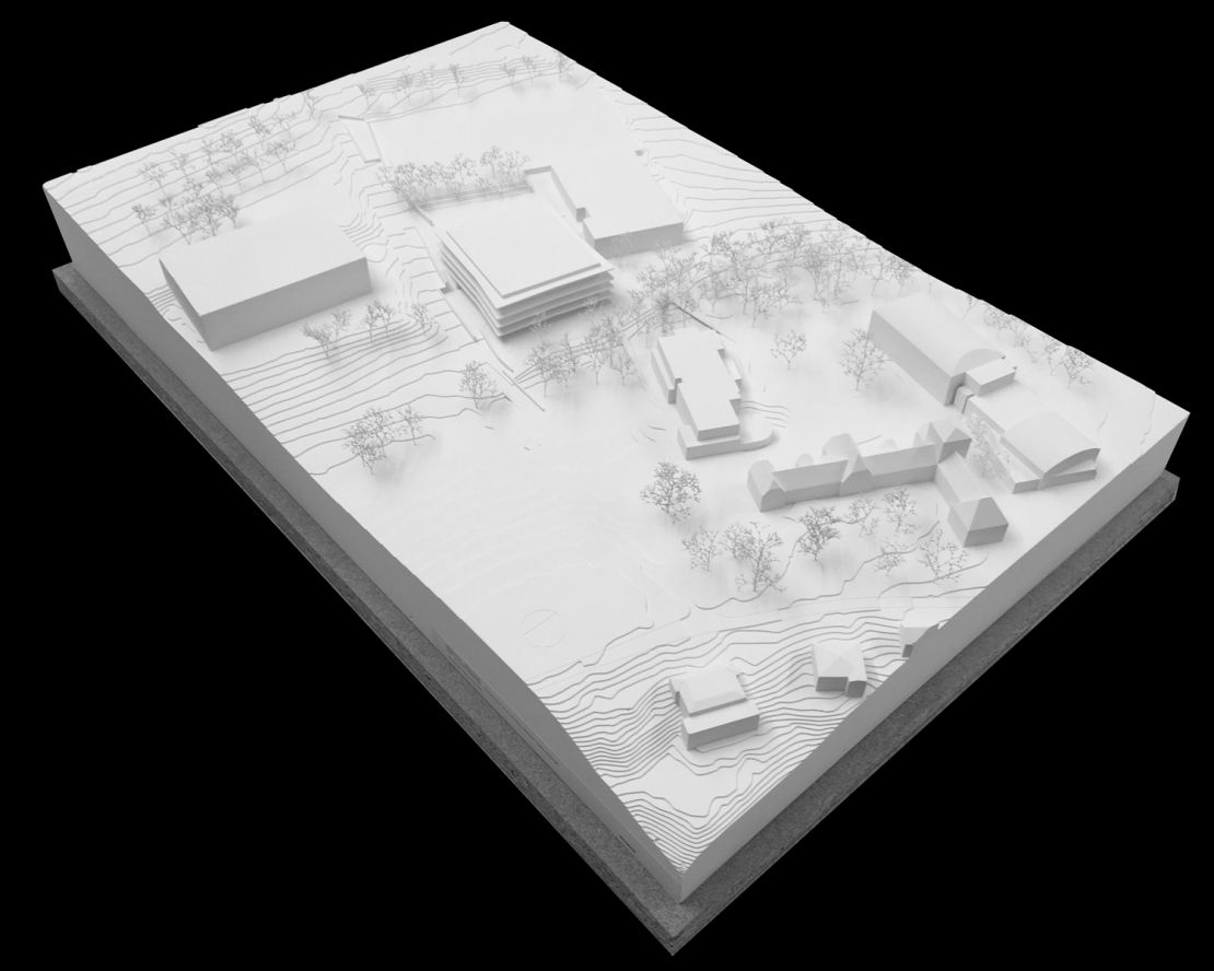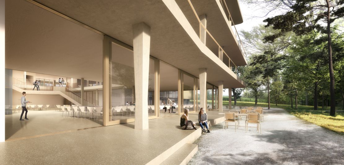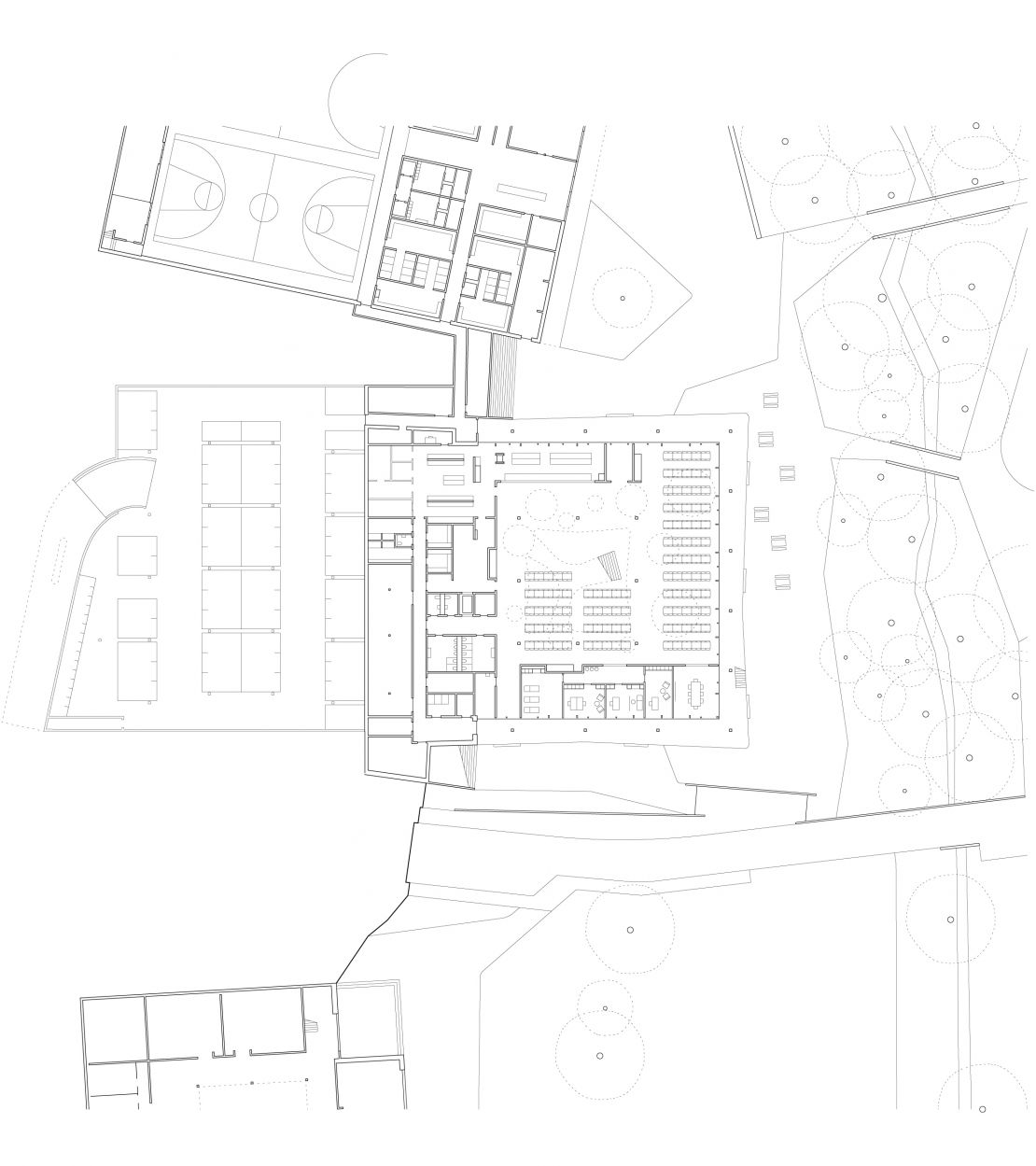 Ce bâtiment multifonctionnel est implanté au centre du campus dont une route constitue l'épine dorsale. Le projet reprend la disposition en quinconce des bâtiments existants, avec lesquels il forme un ensemble. Son intégration dans la pente permet de créer une place haute et une place basse qui diversifient les lieux de vie extérieurs. L'architecture du bâtiment incarne un espace central très ouvert. Construit sur deux niveaux autour d'un vide central, le rez-de-chaussée regroupe le restaurant, des locaux de musique et des locaux administratifs. Les deux étages supérieurs sont dédiés au sport.