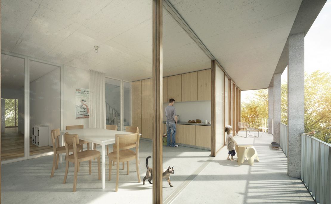 Le bâtiment complète l'amorce d’un îlot ouvert inachevé, comprenant un pavillon central. Côté rue, le projet se place dans le prolongement du front de rue et s'aligne sur les immeubles voisins. Côté cour, une galerie aux angles arrondis s'avance et met en relation le bâtiment avec une cour-jardin. Ce volume abrite aussi bien les locaux communs à l’échelle de l’immeuble : salle commune, pièce indépendante buanderie; que du logement : cuisine-vérandas prolongées par un balcon.