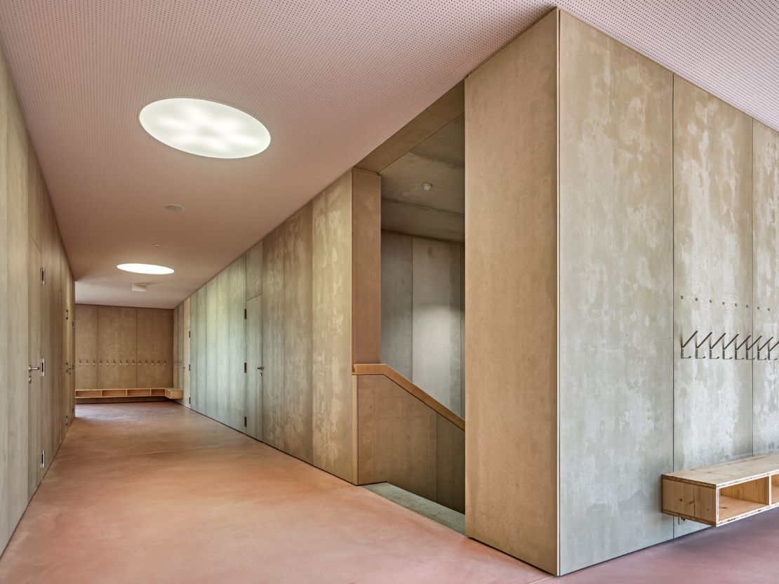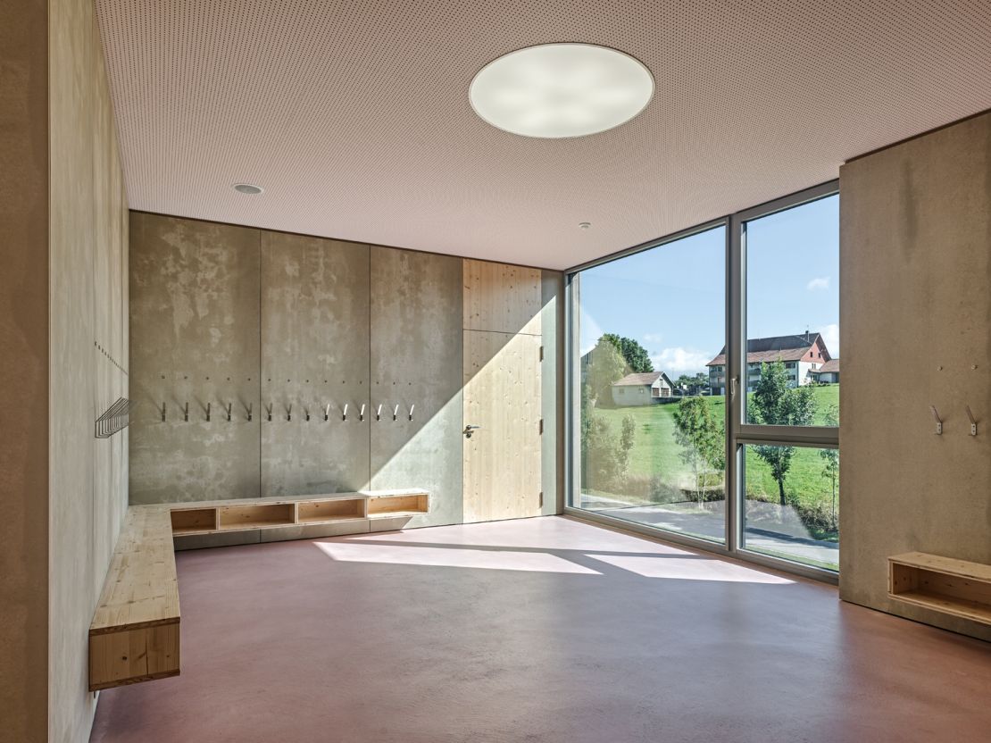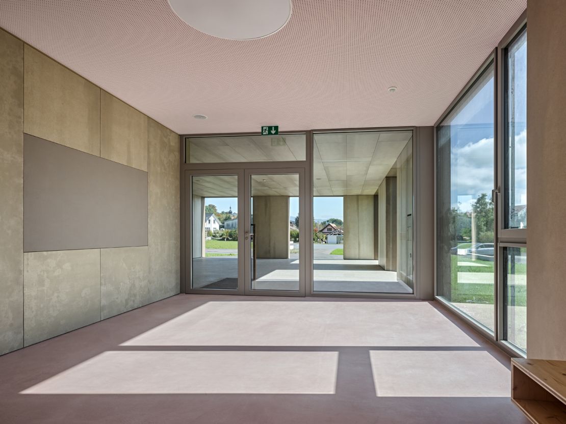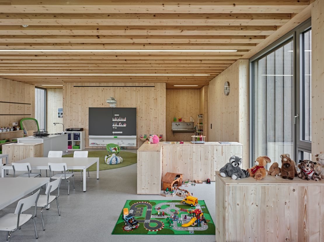 L'identité générale et la cohérence de construction de ce projet se situent dans son plan rayonnant en forme de fleur, qui permet de créer une immersion dans le paysage par le biais de grandes ouvertures. Ouverte sur trois côtés, chaque classe offre un panorama différent selon sa situation. La structure porteuse a été construite avec le bois des forêts environnantes.
