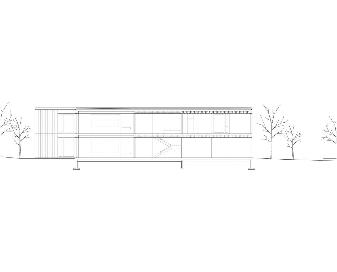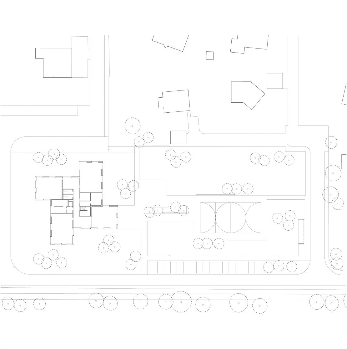 Situé à l'angle d'une zone résidentielle, en bordure de terrains agricoles, ce pavillon scolaire redessine la limite du village. Son implantation définit un espace public bien délimité, propice à la création d'un aménagement paysager.