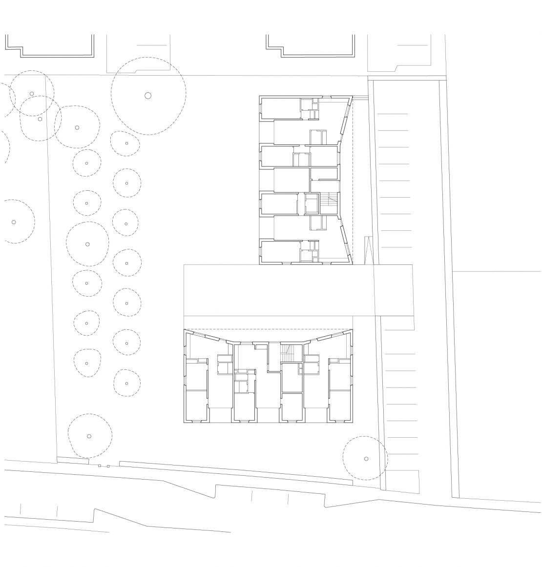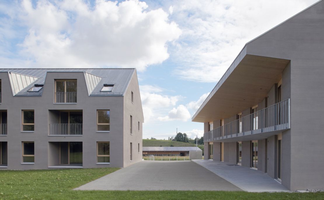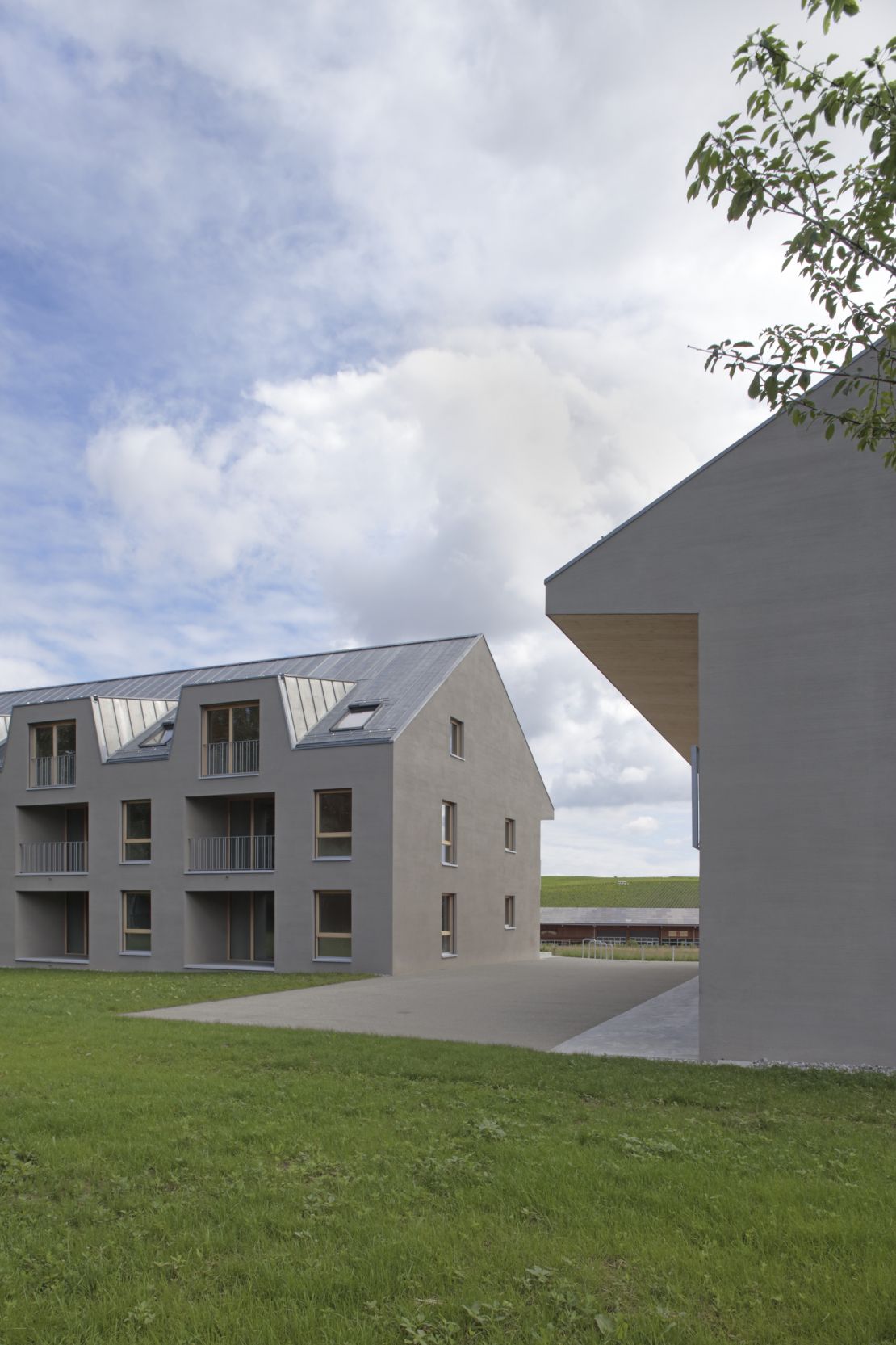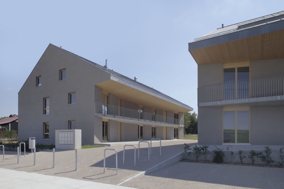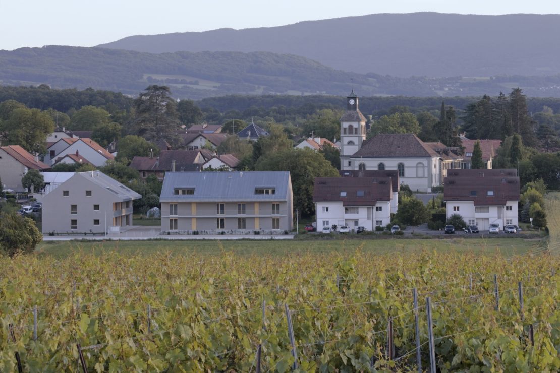 Ces deux immeubles d'habitation se situent à l'entrée du village genevois, face à un vaste paysage ouvert. Inscrit dans un plan de quartier en zone patrimoniale, le caractère traversant des logements tisse un lien entre cour et jardin. La cour est un lieu collectif. Sa nature d'espace partagé se matérialise par un large avant-toit qui protège une coursive d'accès aux logements et aux cuisines. Les jardins sont des espaces semi-privés sur lesquels donnent le séjour, les chambres et une loggia. Sous le toit, les volumes ont été conçus de façon à pouvoir être entièrement habitables.