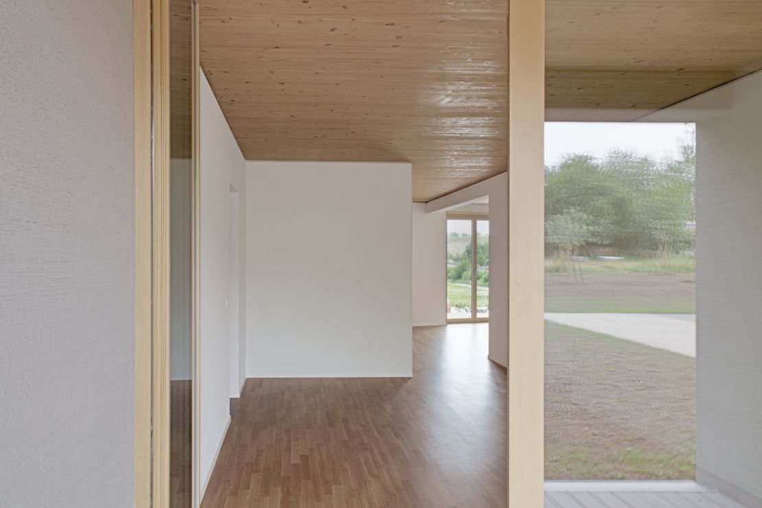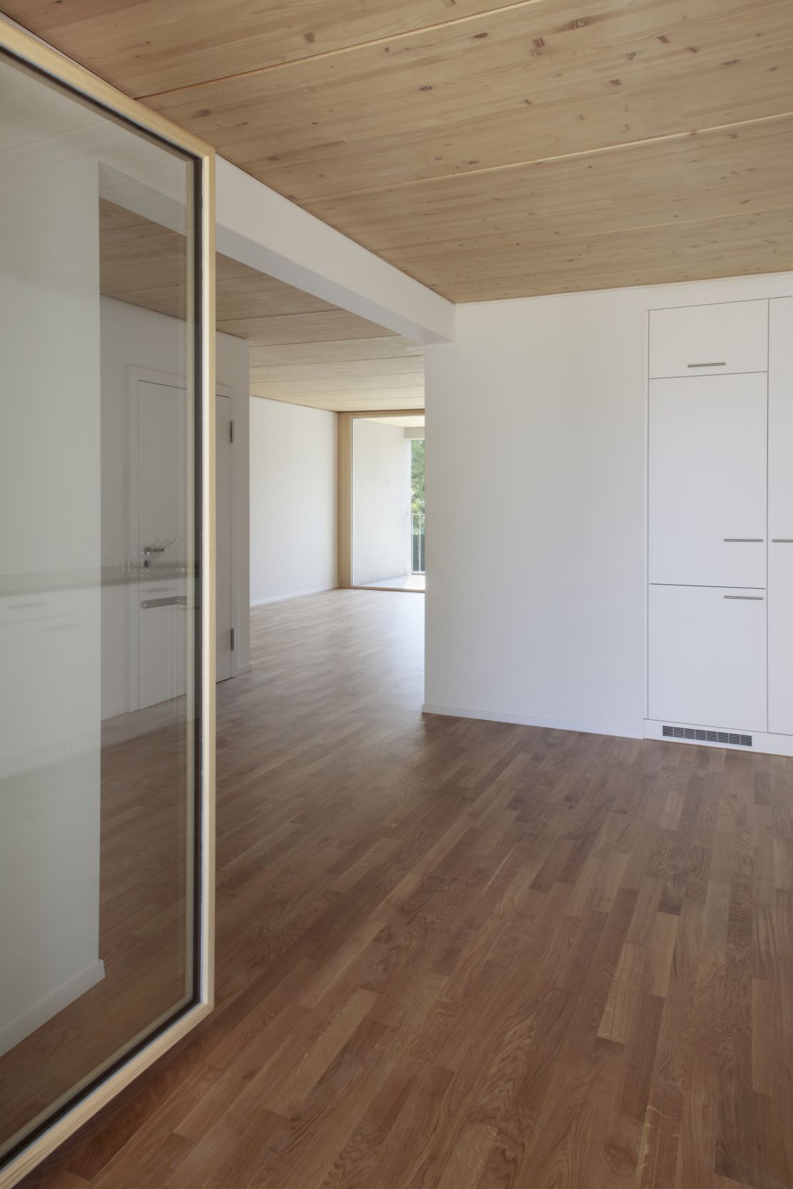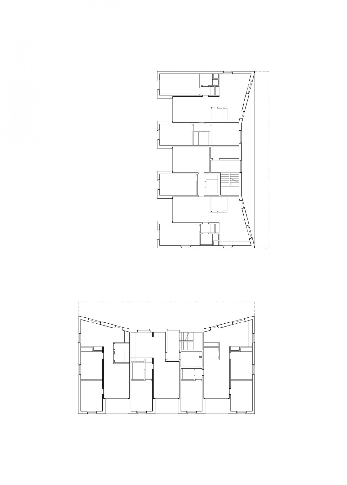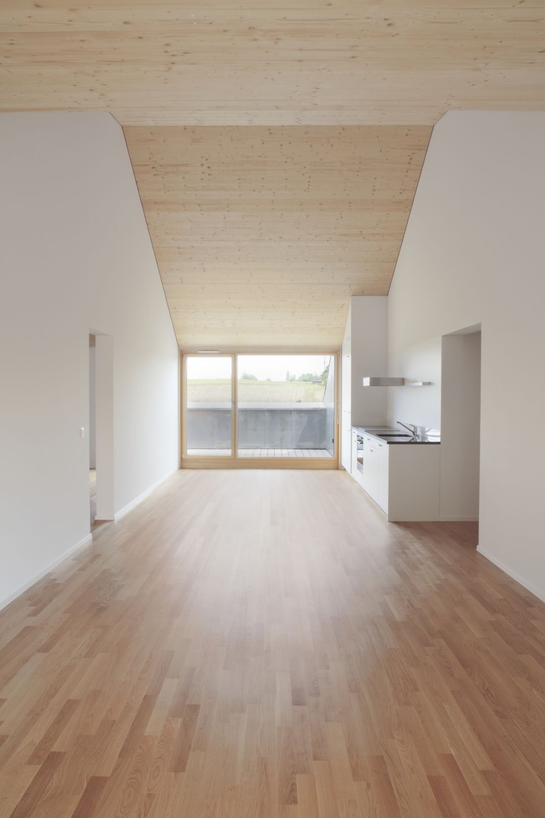 Ces deux immeubles d'habitation se situent à l'entrée du village genevois, face à un vaste paysage ouvert. Inscrit dans un plan de quartier en zone patrimoniale, le caractère traversant des logements tisse un lien entre cour et jardin. La cour est un lieu collectif. Sa nature d'espace partagé se matérialise par un large avant-toit qui protège une coursive d'accès aux logements et aux cuisines. Les jardins sont des espaces semi-privés sur lesquels donnent le séjour, les chambres et une loggia. Sous le toit, les volumes ont été conçus de façon à pouvoir être entièrement habitables.