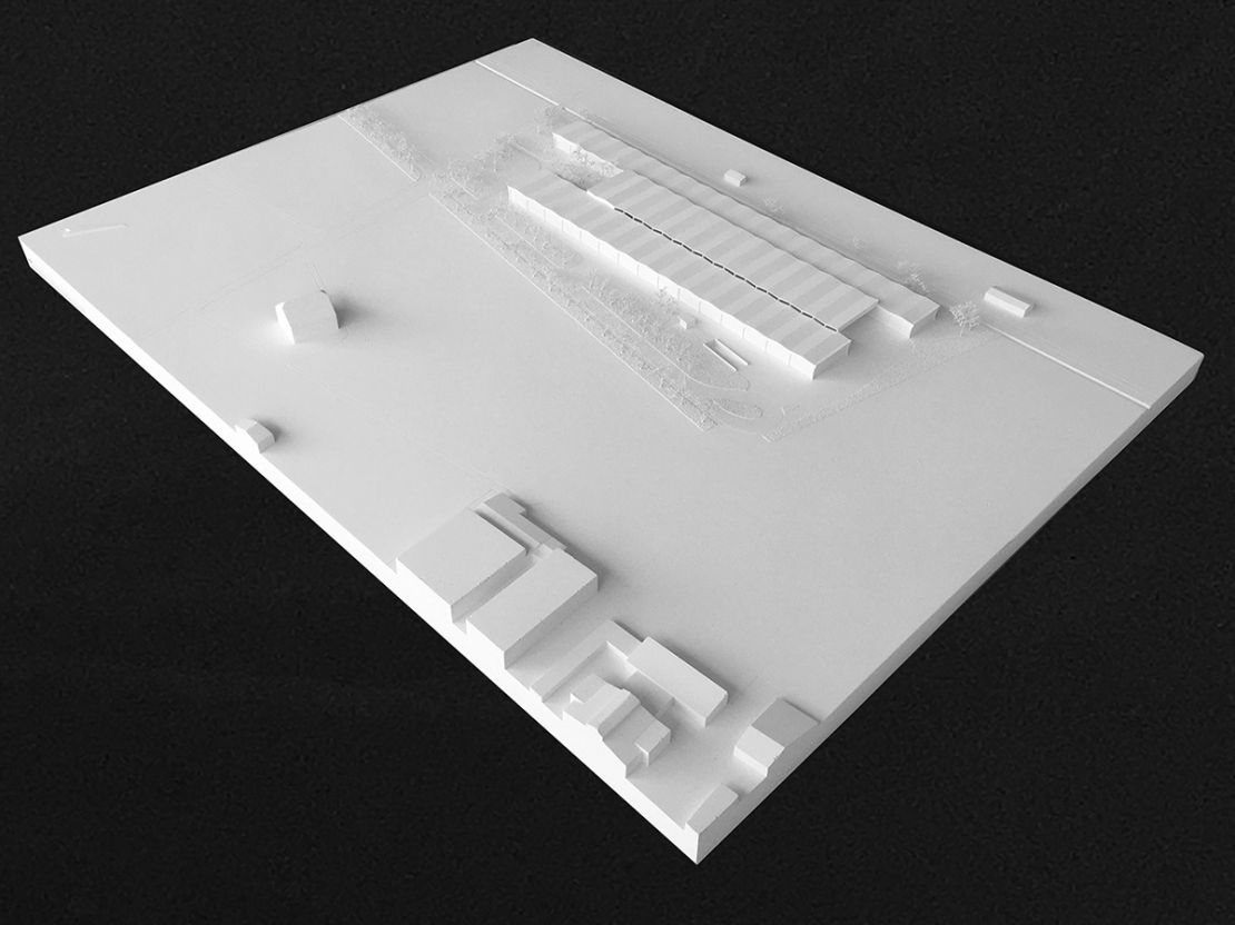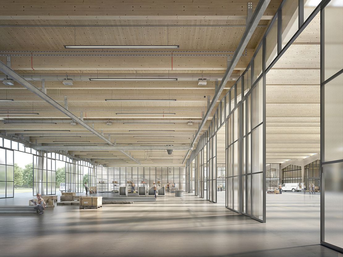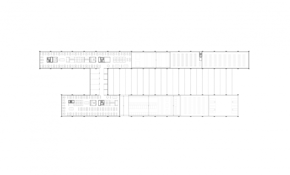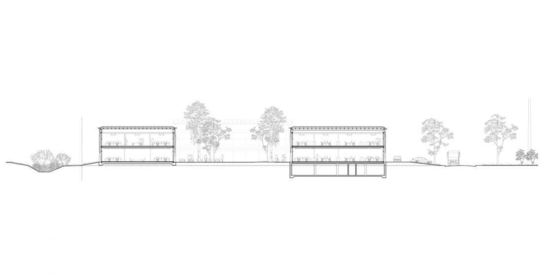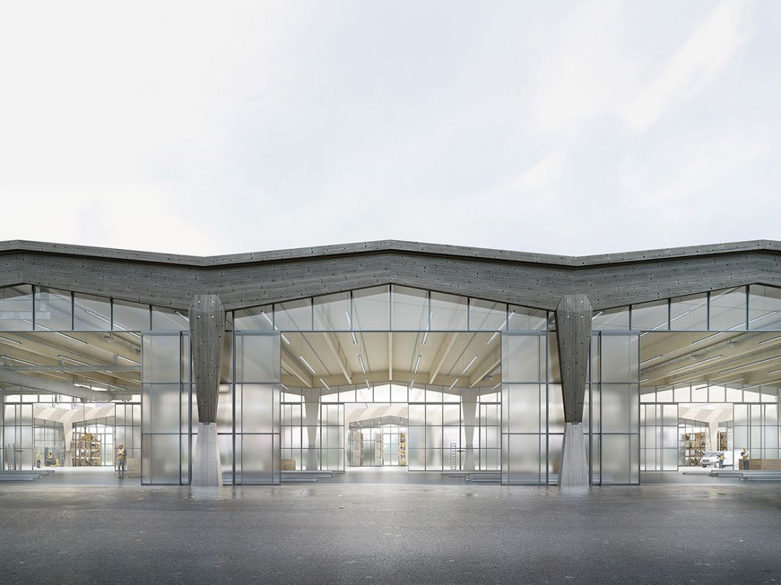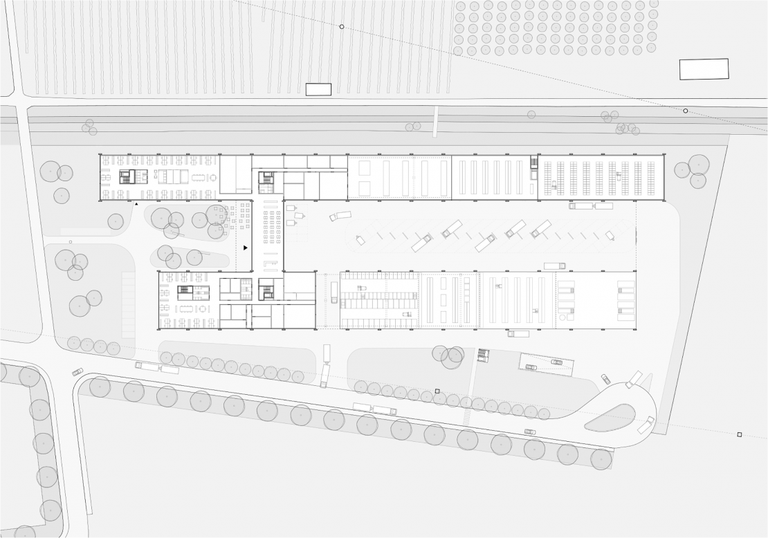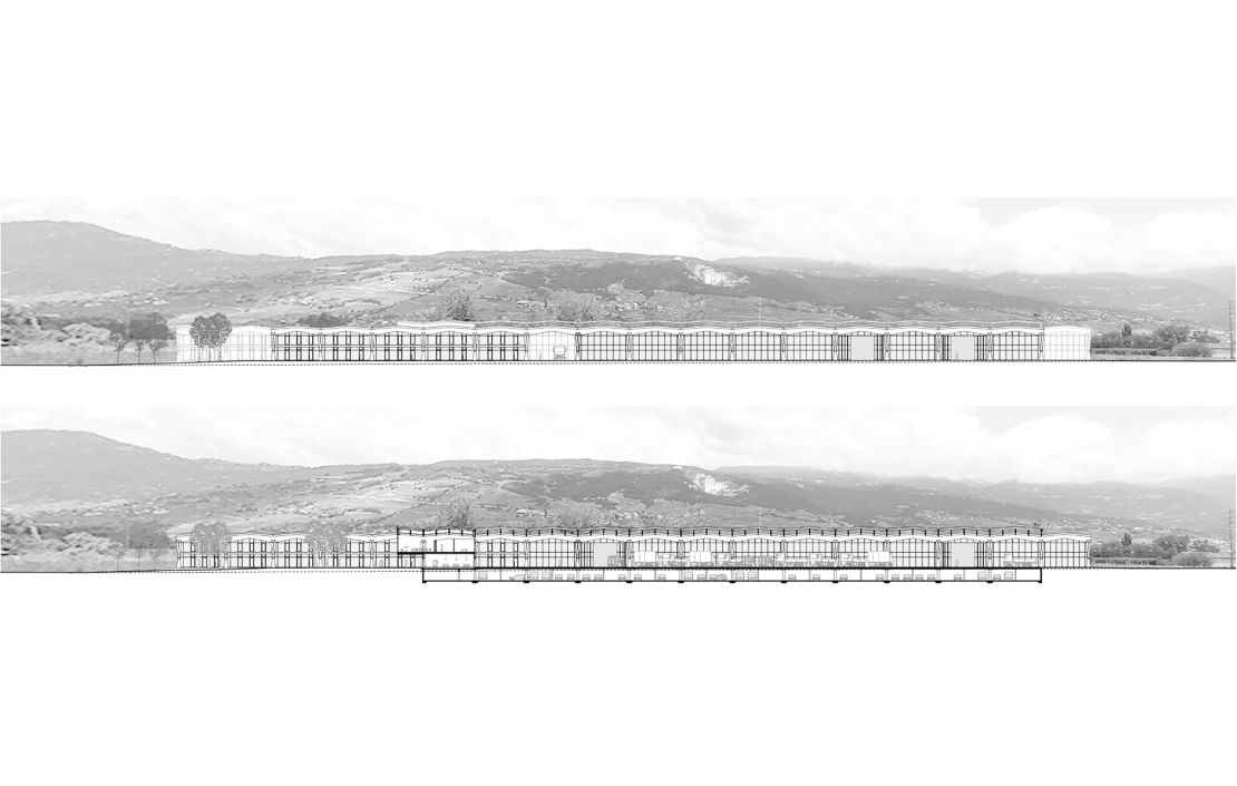 Cette nef industrielle est constituée de trois travées en coupe basilicale. Elle est organisée en bandes avec deux ailes et un coeur commun constitué d'un côté d'un parc d'accès et de l'autre du parking de véhicules. La structure expressive hors-sol est en bois. Comme autant de référence à la zone agricole pré-existante, elle fait écho autant à la structure des serres qu'à celles d'alignements d'arbres ou des vignes alentours. Le projet vise à donner une vision actuelle d'un Parc Industriel en pensant à minimiser l'empreinte écologique de la construction et à optimiser l'utilisation du sol, tout en créant un espace vert à l'intérieur du projet.