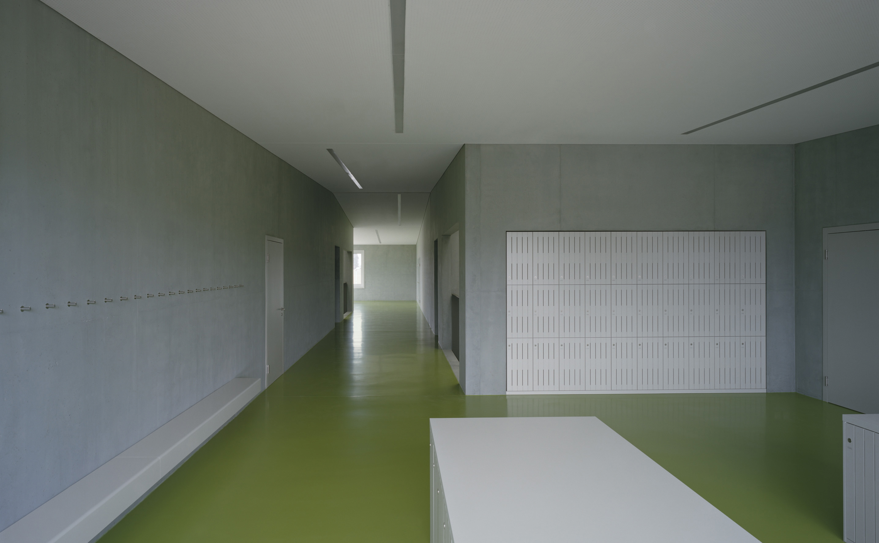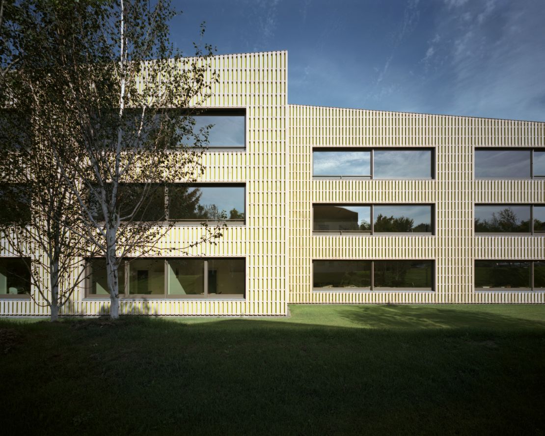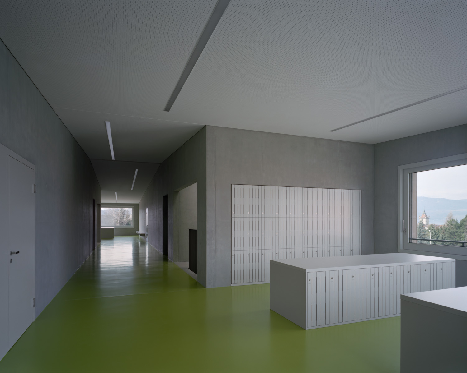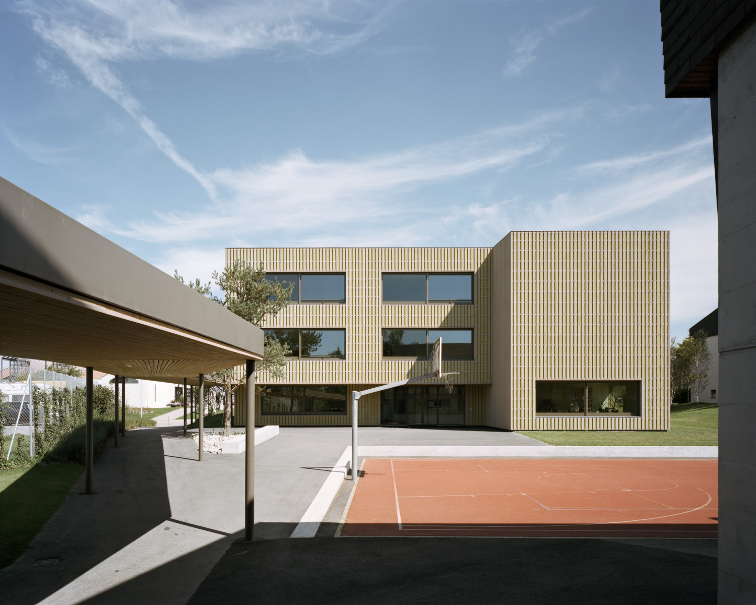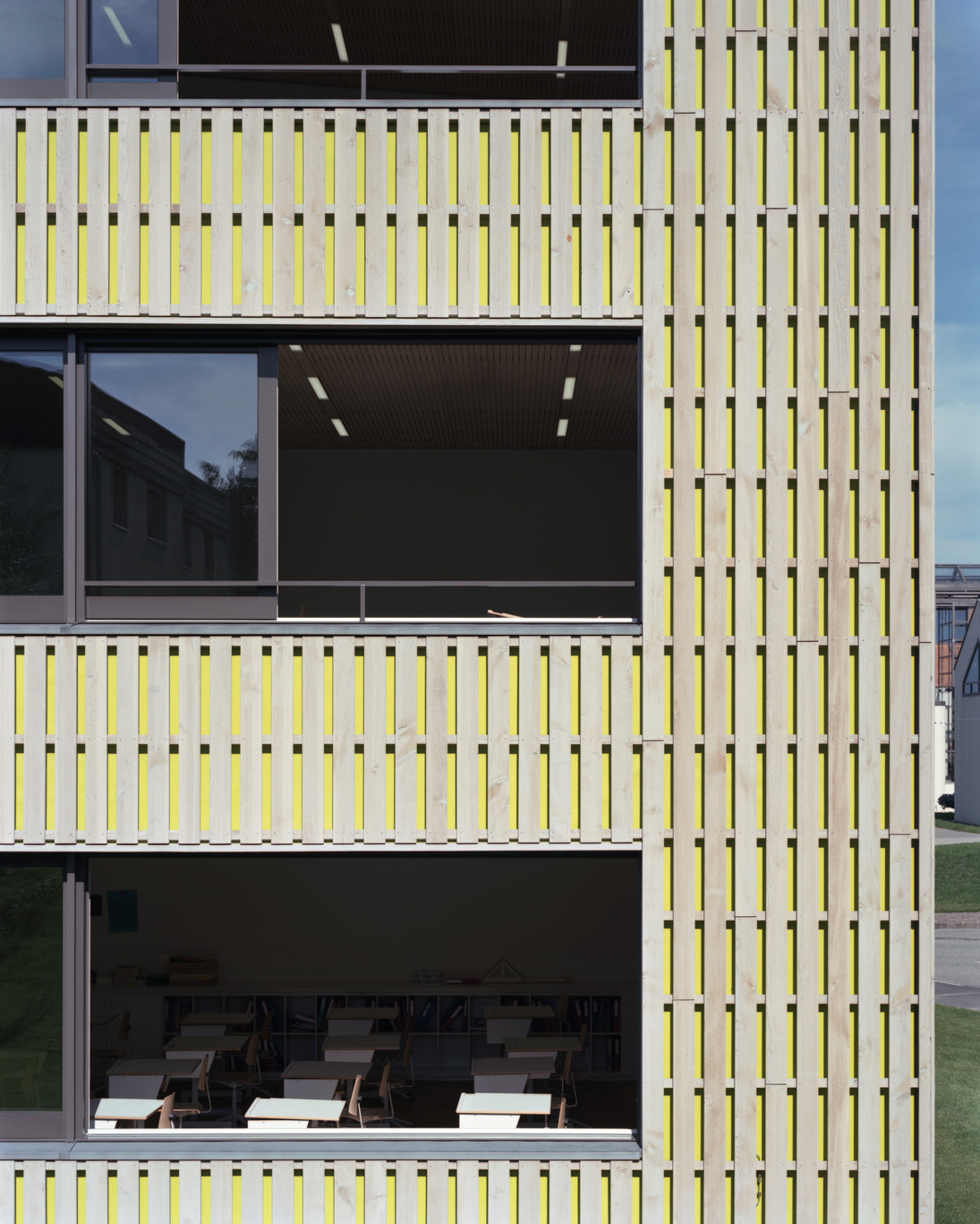 Ce pavillon s'insère dans le site d'une école secondaire composée de six bâtiments. Erigé à distance de l'ensemble existant, le bâtiment apparaît comme un objet posé dans un parc. Son implantation et la végétalisation de ses abords redéfinissent les limites de ce périmètre scolaire. Au coeur du nouveau pavillon, un espace de circulation central en béton prolonge les parcours extérieurs. Ses ouvertures cadrent des paysages caractéristiques du site et de la ville proche. Sur trois niveaux, le couloir distribue des salles de classes dont l'ossature et les dalles sont en bois.