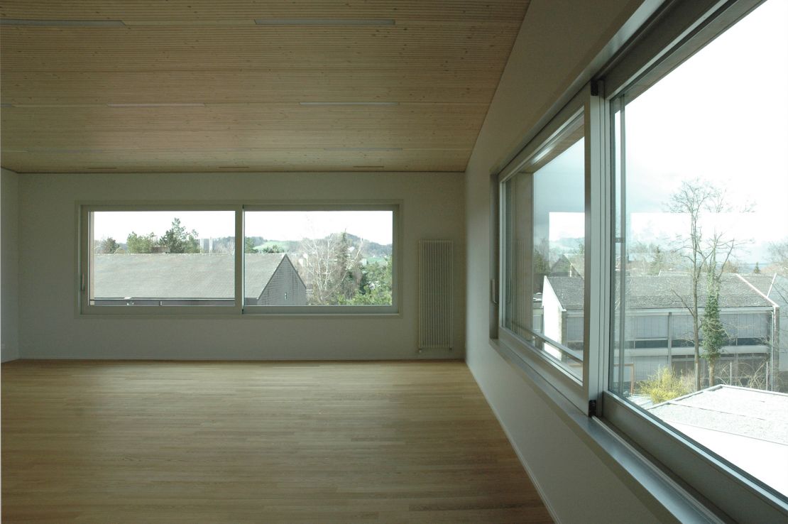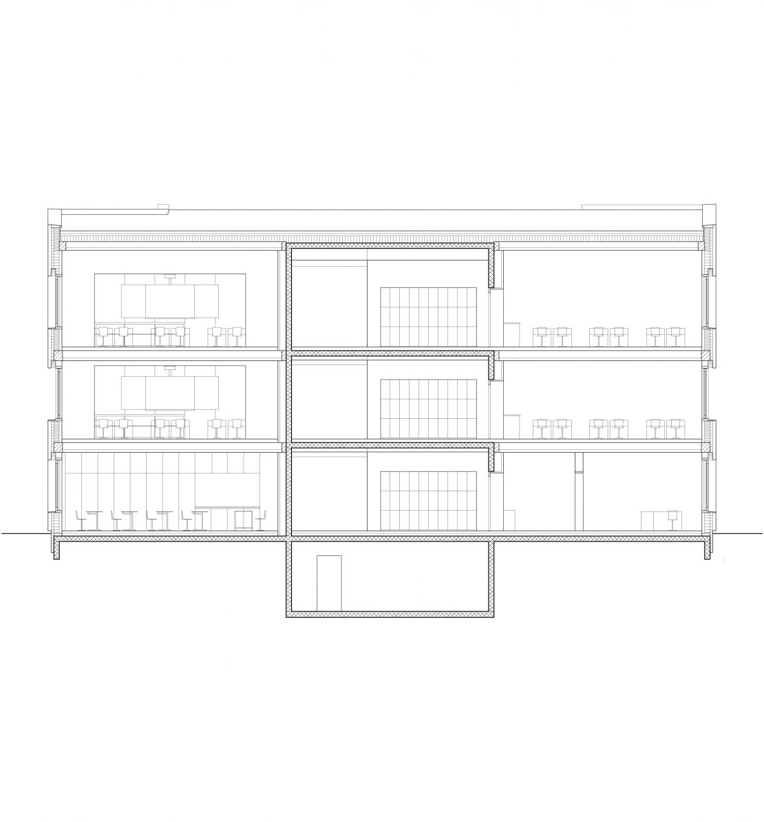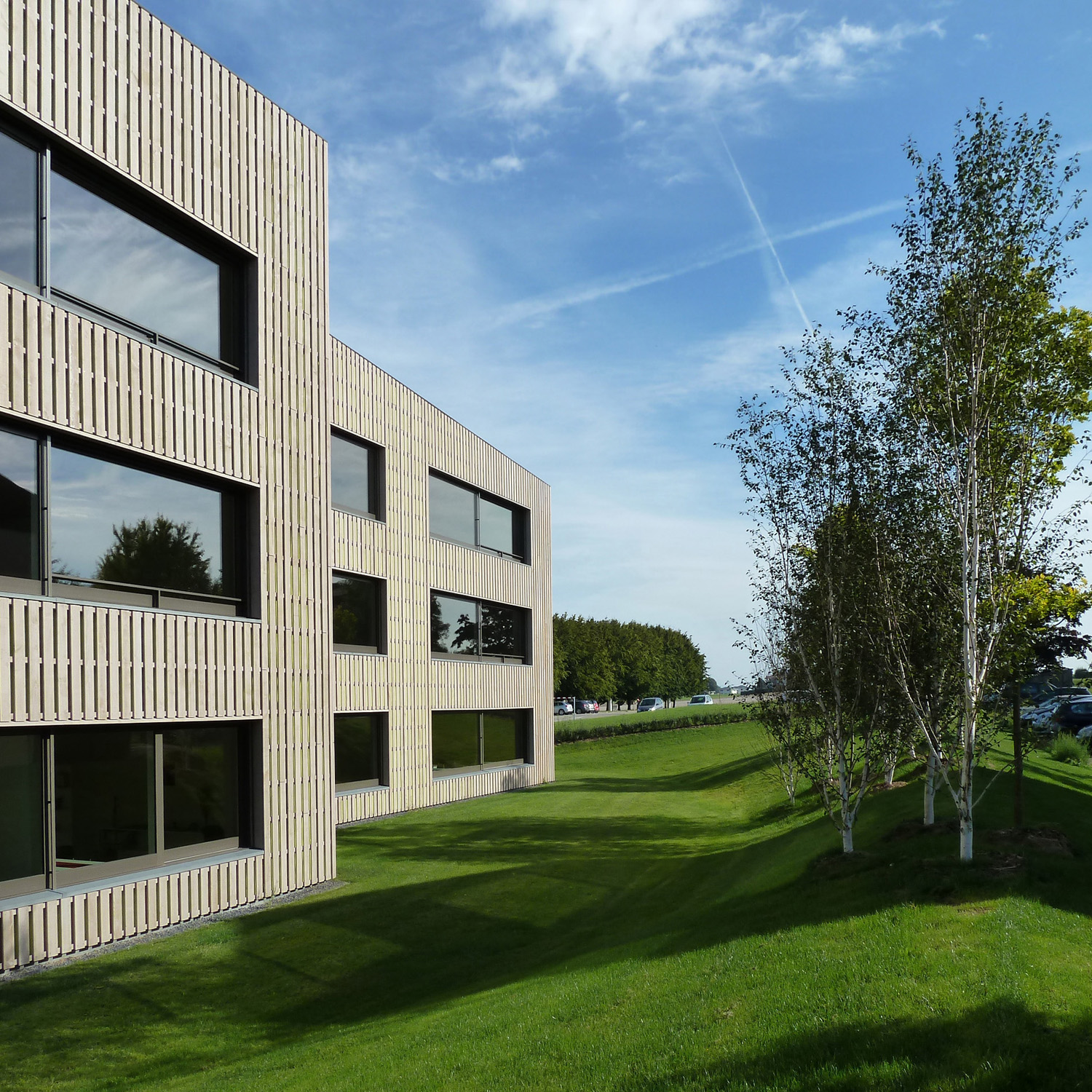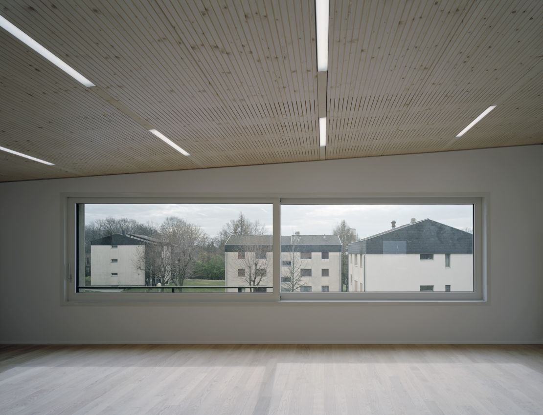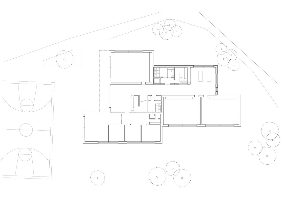 Ce pavillon s'insère dans le site d'une école secondaire composée de six bâtiments. Erigé à distance de l'ensemble existant, le bâtiment apparaît comme un objet posé dans un parc. Son implantation et la végétalisation de ses abords redéfinissent les limites de ce périmètre scolaire. Au coeur du nouveau pavillon, un espace de circulation central en béton prolonge les parcours extérieurs. Ses ouvertures cadrent des paysages caractéristiques du site et de la ville proche. Sur trois niveaux, le couloir distribue des salles de classes dont l'ossature et les dalles sont en bois.