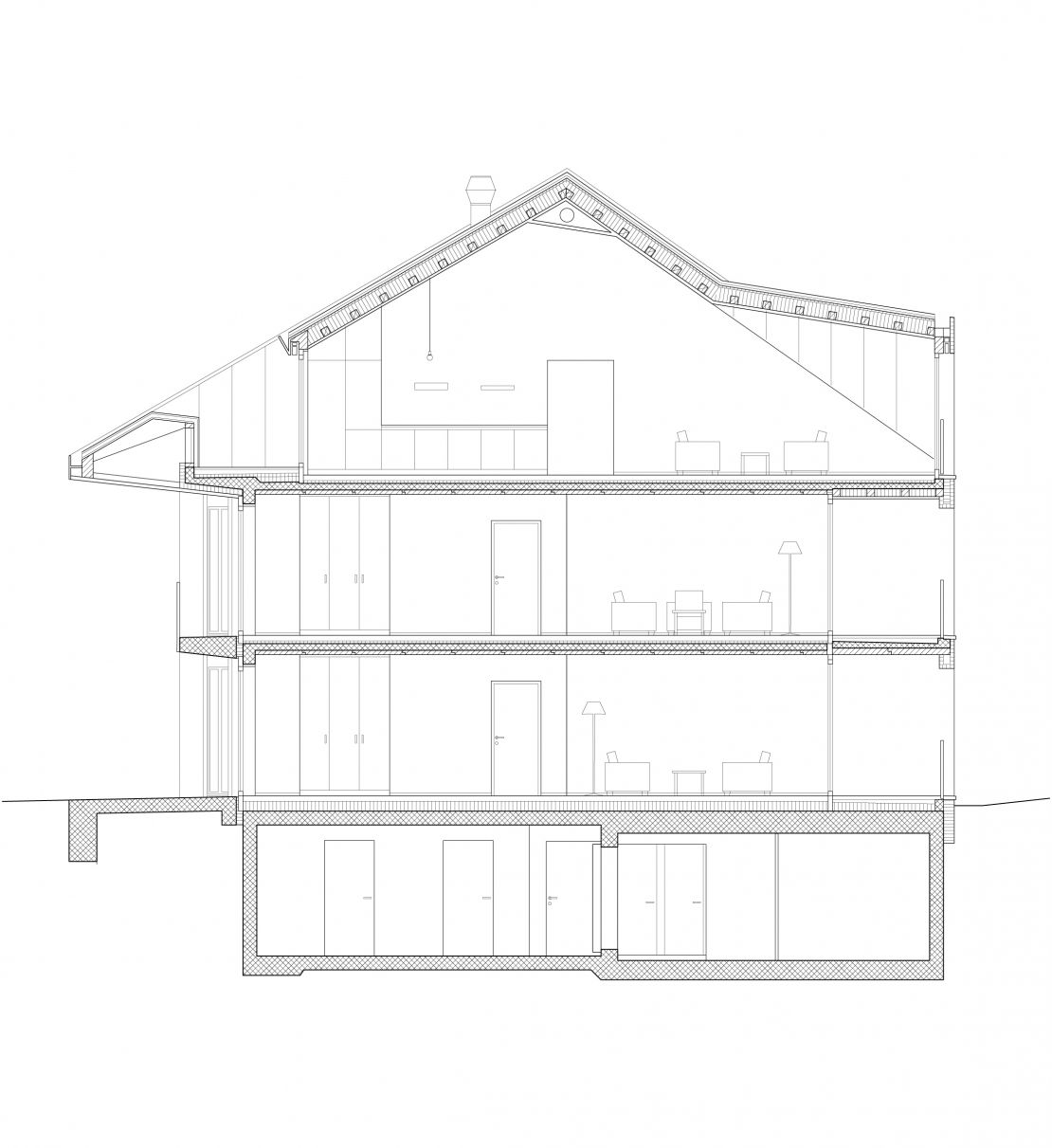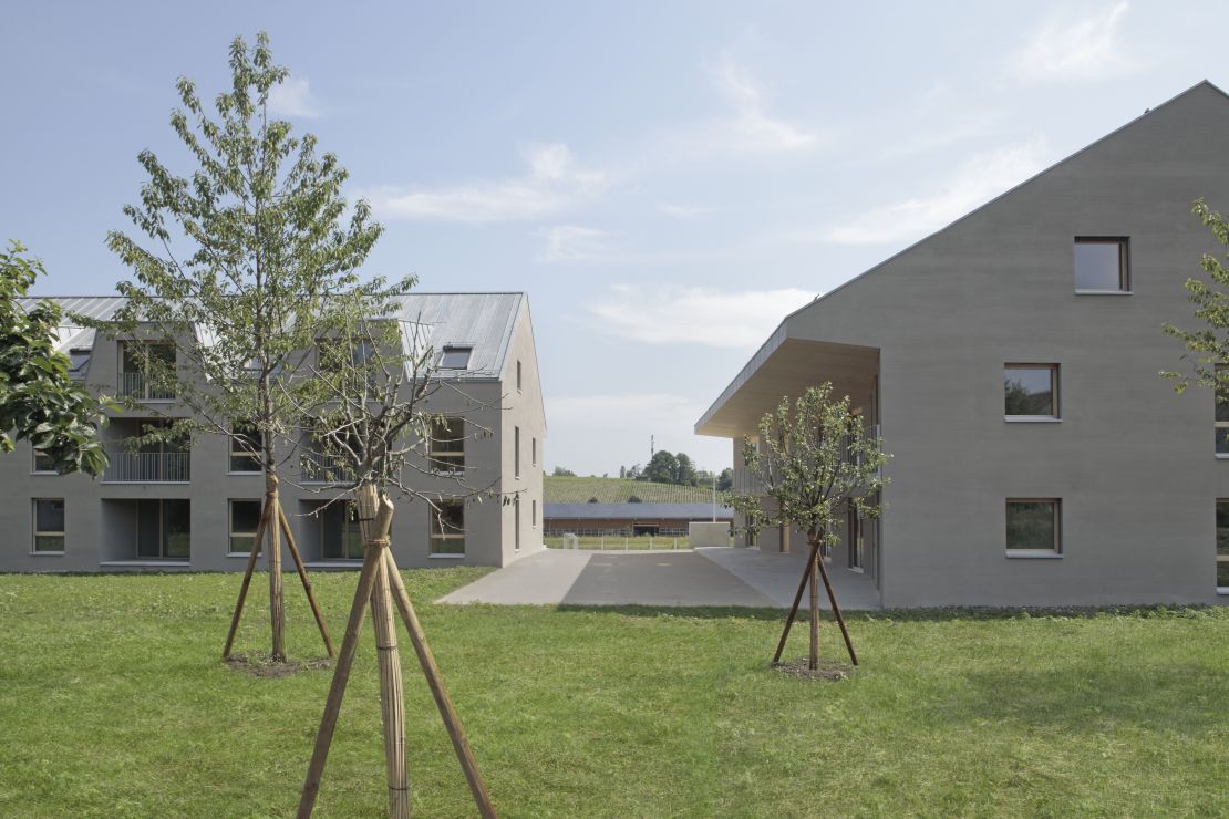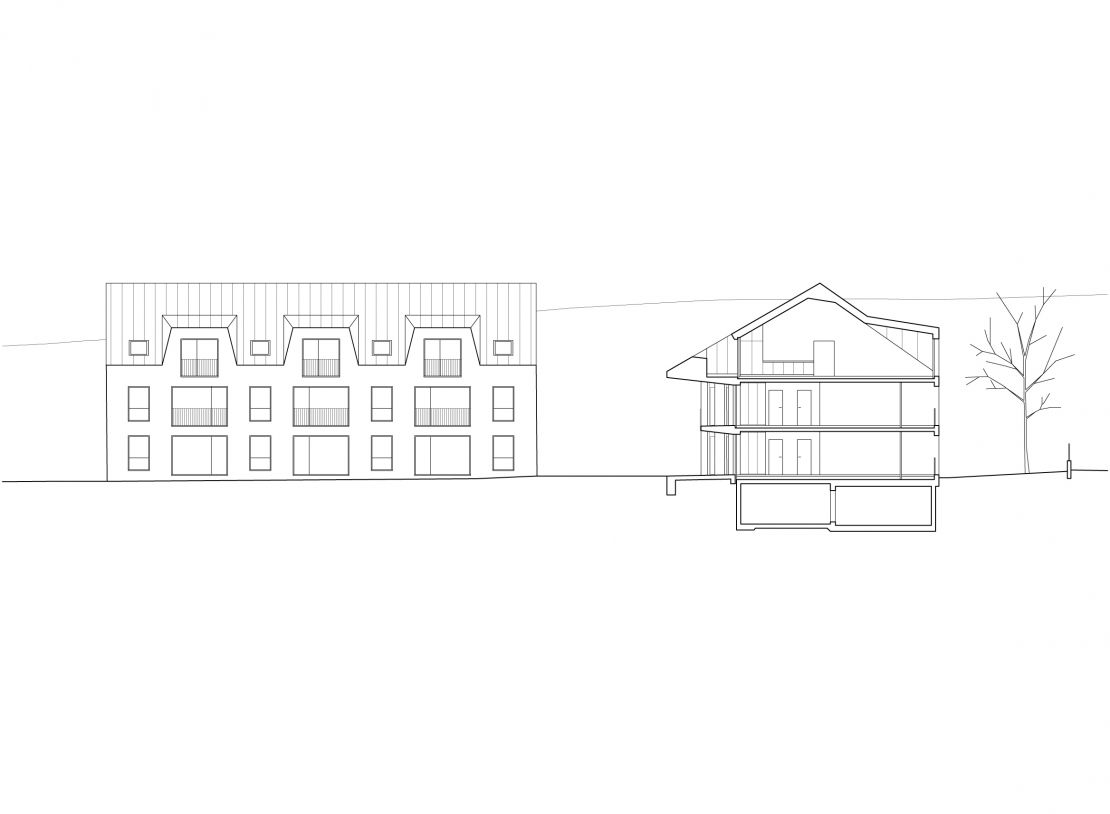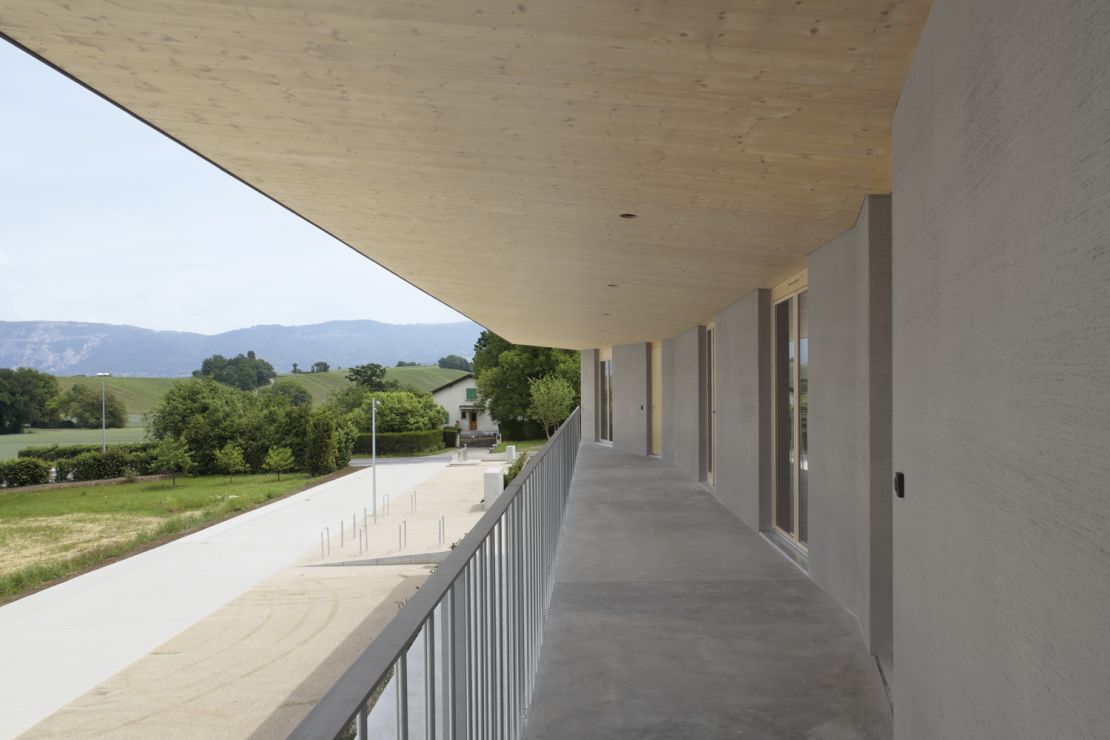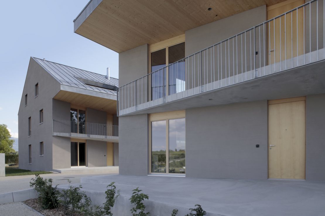 Ces deux immeubles d'habitation se situent à l'entrée du village genevois, face à un vaste paysage. Inscrit dans un plan de quartier en zone patrimoniale, le caractère traversant des logements tisse un lien entre jardin et cour collective. Sa nature d'espace partagé se matérialise par un large avant-toi qui protège une coursive d'accès aux logements et aux cuisines. Les jardins sont des espaces semi-privés sur lesquels donnent le séjour, les chambres et une loggia. Sous le toit, les volumes ont été conçus de façon à pouvoir être entièrement habitables.